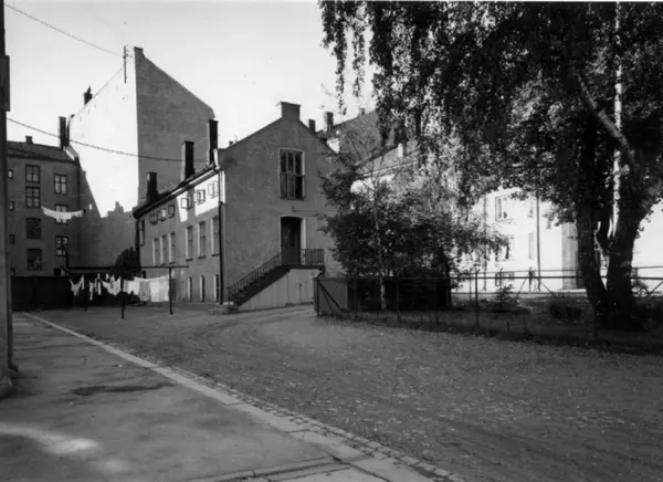 Toftes gate 25, Grünerløkka, Oslo 1961. "Sagenes Arbeiderboliger". Gårdsrommet med "uthuset".