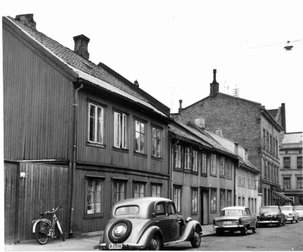 Stolmakergata, Grünerløkka, Oslo 1961. Trehusbebyggelse med biler parkert langs fortauet. Biltyper f. v.: Mercedes-Benz 170 1937-53, DKW Junior ca 1960, Studebaker 1950-51