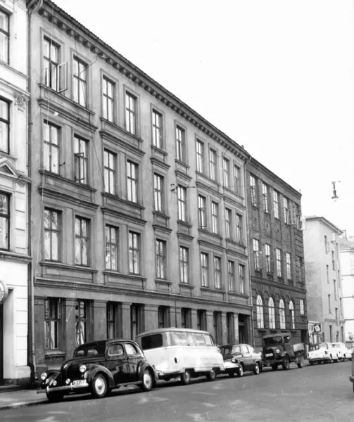 Hesselbergsgate 11, Grünerløkka, Oslo 1961. Bygårder og biler parkert ved fortauet.