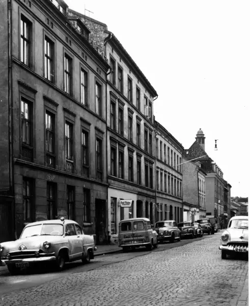 Korsgata 29 (nærmest), 27 og 25. Grûnerløkka, Oslo 1961. Gatebilde med bygårder og parkerte biler. Biler av typen Henry J 1952-54 og Opel Rekord 1953-54