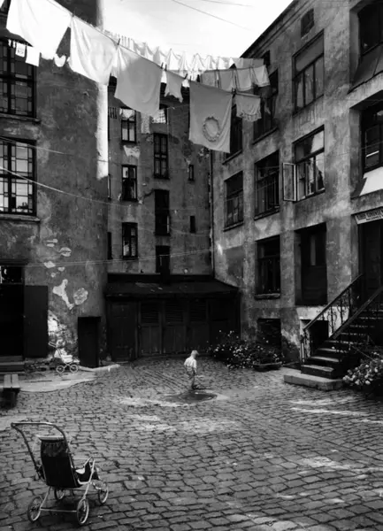 Schleppergrellsgate 7, Grünerløkka, Oslo 1961. Bakgård med barnevogn, klesvask og liten gutt som leker.