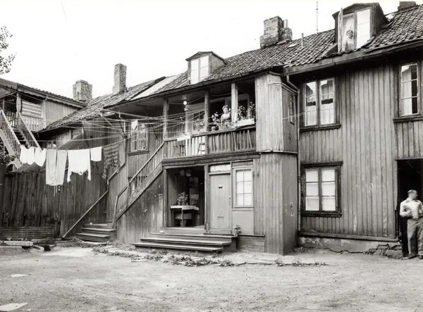 Korsgata 15, Grünerløkka, Oslo 1961. Bakgård med trehusbebyggelse og klessnorer.