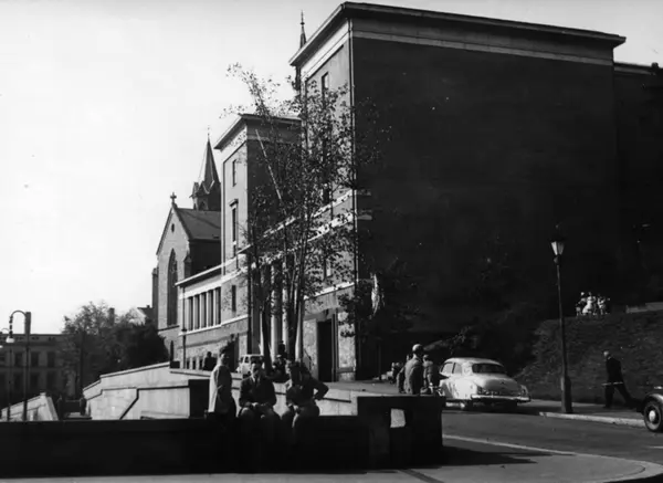 Deichmanske bibliotek, Oslo. Ca. 1950. Gatebilde med fasaden. Trefoldighetskirken i bakgrunnen.
