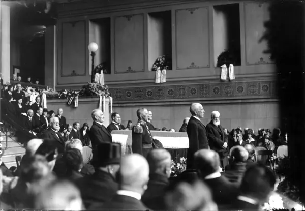 Fridtjof Nansen. Hans begravelse 17. mai 1930. Fra Søylehallen på Universitetet, Oslo. Hans kiste. Kranser. Æresgjester.