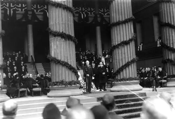 Fridtjof Nansens begravelse 17. mai 1930. Hans kiste på lit de parade i søylehallen på Universitetet, Oslo. Søylene pyntet med flagg og grønt. Æresgjester. Publikum på Universitetsplassen.