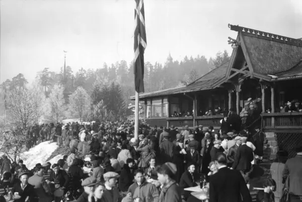 Frognerseteren - Oslo. Vintermotiv. Mennesker samlet foran restauranten. Flaggstang med flagg.