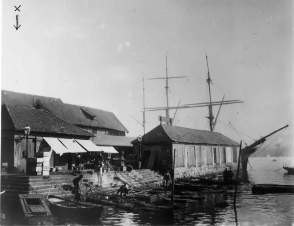 Oslo havn 1900-05. Hus, trapp, småbåter og seilskute på baksiden.