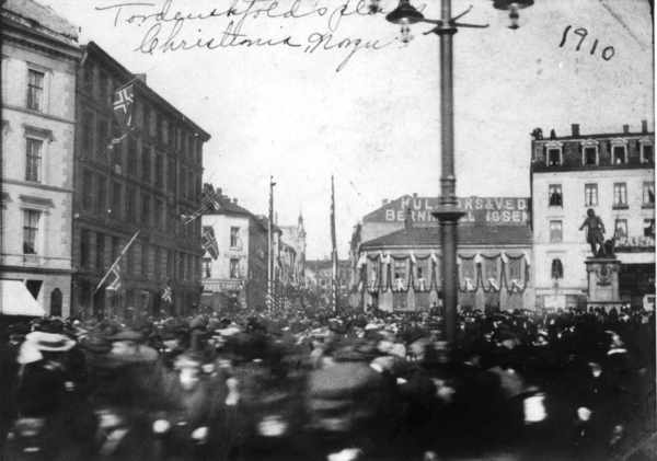 Tordenskiolds plass, Oslo 1910. Menneskemengde samlet, muligens under Theodore Roosevelts besøk 1910.