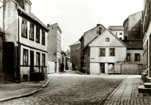 Strandgaten og Bryggegata, Pipervika, Oslo. Gate med brostein trehus og bygårder.