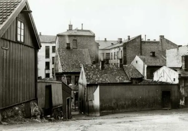Strandbakken, Pipervika, Oslo. Gate med trehus, uthus og bygårder.