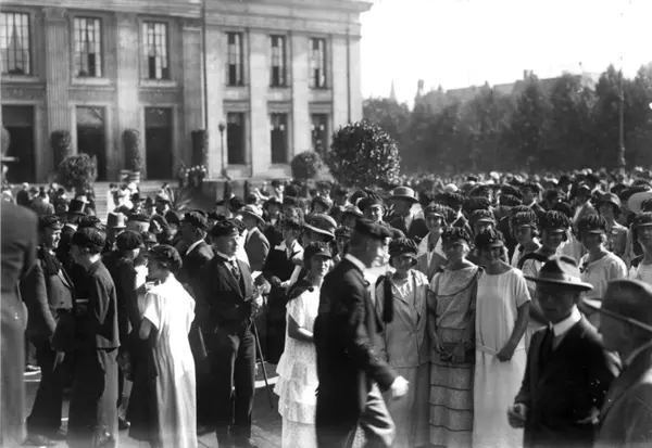 Immatrikulering. Universitetsplassen, Oslo, med bl.a. studenter fra Oslo Katedralskole t.h. 1924.