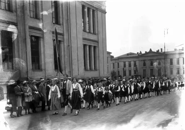 Nordisk Folkedansstevne ant. Karl Johans gate ved Universitetet - Oslo. 1925. Opptog av norske folkedansere.