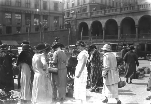 Sommerklær. Youngstorget, Oslo. 1924. Kvinner på torghandel. Kjerrer. Biler. Bybebyggelse.