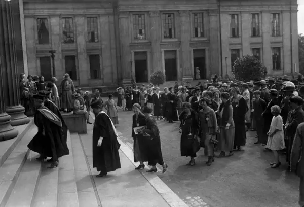 Oslo, Universitetsplassen. Kvinnelige akademikeres verdenskongress 1924. Kvinner på vei opp Aulatrappen