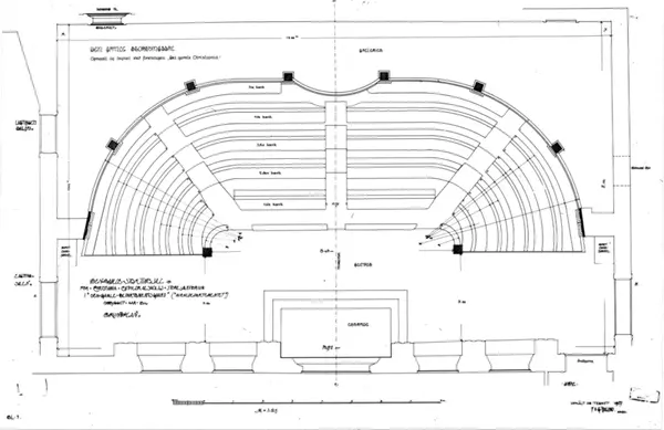 Dronningens gate 15,Oslo. Ark. tegn over Den gamle Stortingssalen (nå NF) av Fritz Holland ved oppmåling.