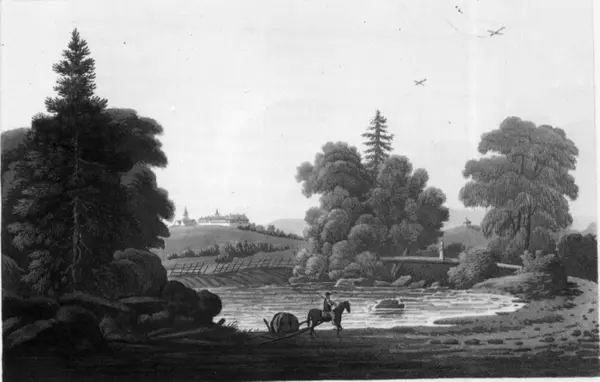 Ullevål, Oslo. Avfotografering av akvatintetsning av Carpelan. Brukt til utstillingen "Reise i 1814" ved NF. Mann ridende på hest, foran en dam med jorder og hus i bakgrunnen.