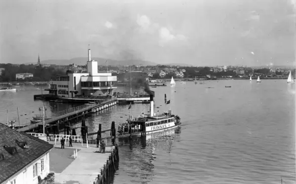 Oslo, Dronningen restaurant, Bygdøy. 1932. Restauranten, fjorden med båter og brygge med ferje.