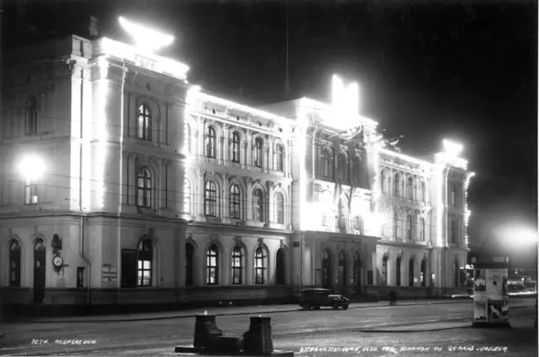 Håkon VII's 25. års jubileum. 1930. Østbanen i Oslo opplyst. Gate. En bil foran stasjonsbygningen..