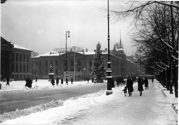 Oslo. Juletreet på Universitetsplassen. 1930. Snø. Karl Johans gate i forgrunnen. Universitetsbygningene i bakgrunnen. Fotgjengere.