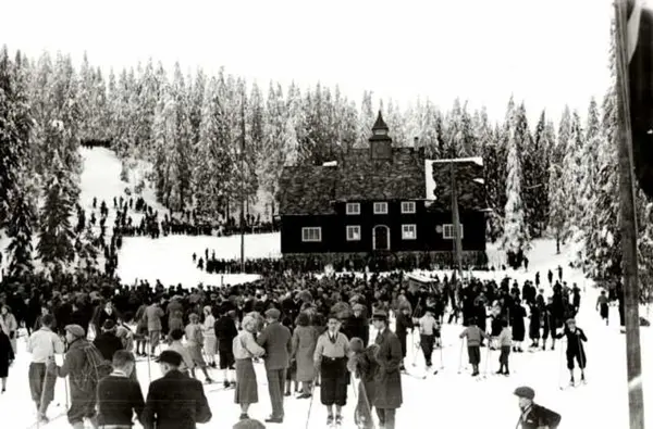 Frognerseteren, Nordmarka, Oslo. Vintermotiv. Skirenn. Publikum i løypeområdet. Hus og skog i bakgrunnen.