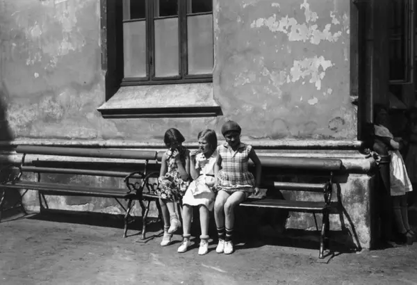 Oslo. Småjenter kledd i kjoler på en benk ved Ruseløkka skole. Mai 1932.