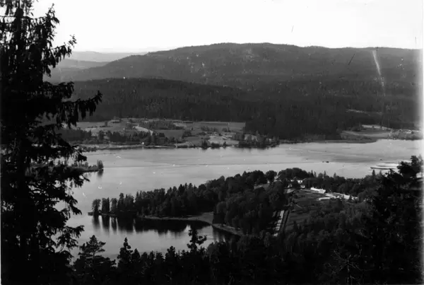 Bogstad gård, Bogstadvannet og landskapet omkring. Oversiktsbilde. Sett fra Lillevann ca. 1923. Bebyggelse og skog i bakgrunnen.