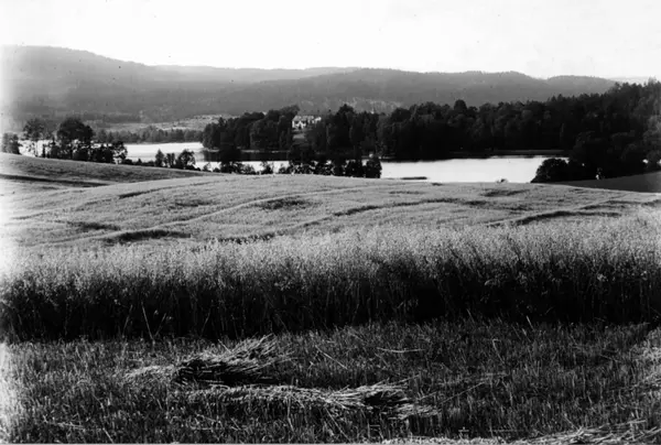 Bogstad gård ca. 1923. Bogstadvannet. Hovedbygningen med parken i bakgrunnen. Skog. Kornåkre i forgrunnen.