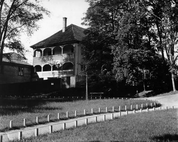Postkort. Oslo, Frogner hovedgård, 1900-09. Enden av huset med verandaer.