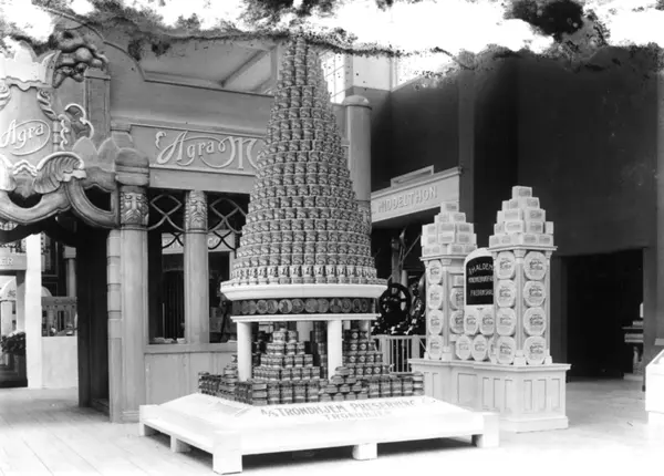 Jubileumsutstillingen på Frogner, Oslo, 1914. Interirør paviljong. Utstilling av hermetikk og margarin.