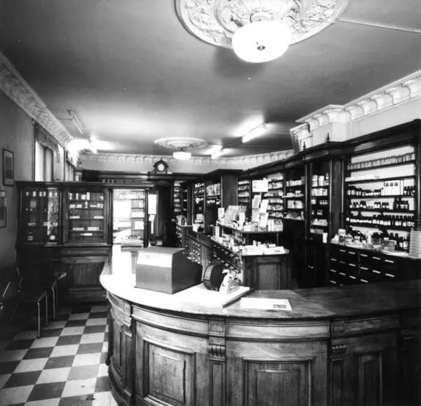 St. Hanshaugens apotek i Collettsgt. 33, Oslo. Fotografert november 1972. Apoteket ble opprettet i 1899 og åpnet 19. august 1900. De holdt til i de samme lokalene til apoteket ble lagt ned i 1973.