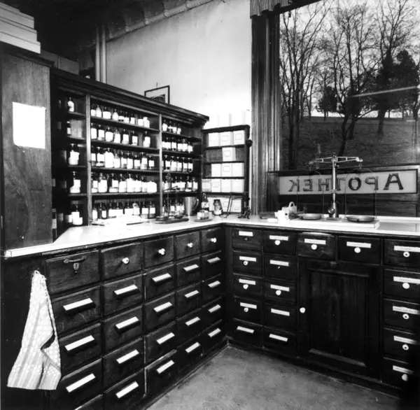 St. Hanshaugens apotek i Collettsgt. 33, Oslo. Fotografert november 1972. Apoteket ble opprettet i 1899 og åpnet 19. august 1900. De holdt til i de samme lokalene til apoteket ble lagt ned i 1973.