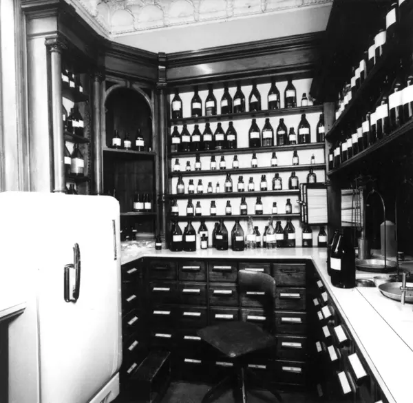 St. Hanshaugens apotek i Collettsgt. 33, Oslo. Fotografert november 1972. Apoteket ble opprettet i 1899 og åpnet 19. august 1900. De holdt til i de samme lokalene til apoteket ble lagt ned i 1973.