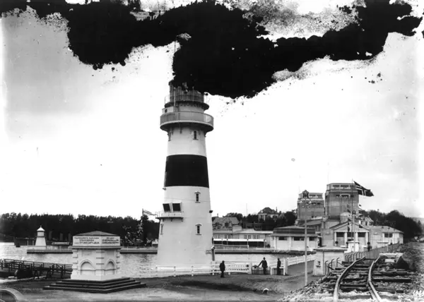 Jubileumsutstillingen på Frogner, Oslo, 1914. Den maritime avdelingen på Skarpsno med paviljonger og brygger.