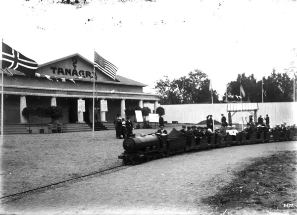 Jubileumsutstillingen på Frogner, Oslo, 1914. Tanagra dukketeater i bakgrunnen. I forgrunnen en lilleputtbane. Tog for publikum. Norsk og amerikansk flagg.