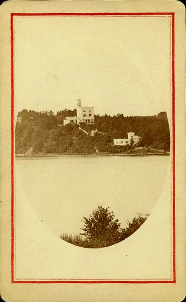 Oscarshall, Oslo, sett fra andre siden av Frognerkilen. Visittkortformat. Del av gave fra Den Norske Turistforening 1972.