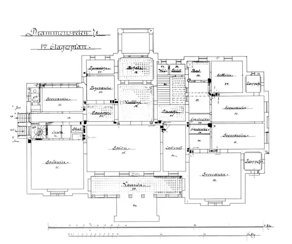 Videnskapsakademiet. Drammensveien 78, Oslo. Foto av tegning av 1. etasje. 1885. Arkitekt Herman Major Backer.