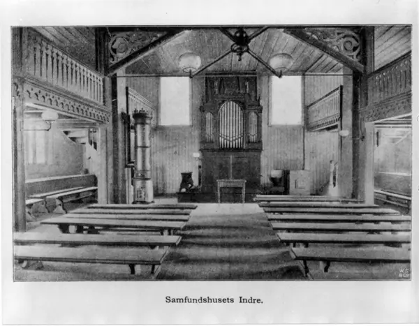 Enerhaugens Samfundshus, Oslo, Kristiania ant. 1900. Interiør med benker, orgel og vedovn.