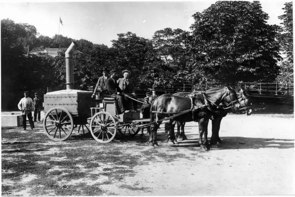 Hærens feltbakeri, Verdal, Nord-Trøndelag, ca.1900. Feltmanøver med bakerovn trukket av hester i Trondheimsdistriktet. Bakermester Haakon Hansen, A. Hansens Bakeri på manøver.