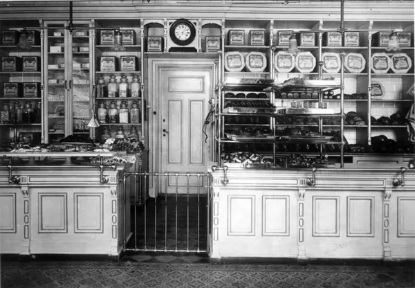 A. Hansens Bakeri, Bogstadveien 54, Oslo, 1913. Interiør fra butikken med disker og hyller med varer.