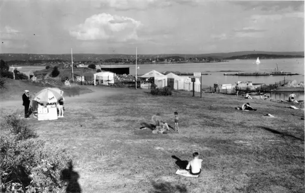 Friluftsliv. Antakelig Huk, Bygdøy. 1935. Utsikt mot øyene og byen. På stranden ses badegjester og i bakgrunnen flere salgsboder. På fjorden er det båttrafikk.