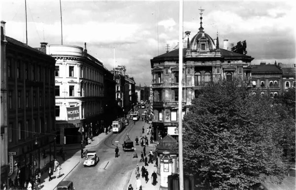 Karl Johans gate, Oslo 1936. Sett nedenfra mot Stortinget. Trafikk med fotgjengere, biler og trikk.