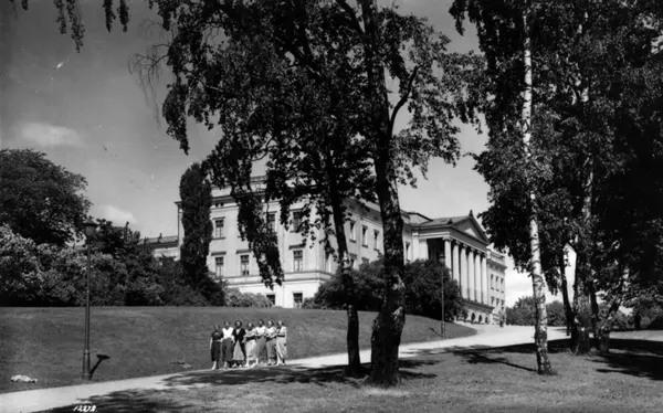 Slottet og Slottsparken, Drammensveien 1, Oslo 1934 sett fra Drammmensveien. Kvinner som går arm i arm, gjennom parken på vei mot Drammensveien.