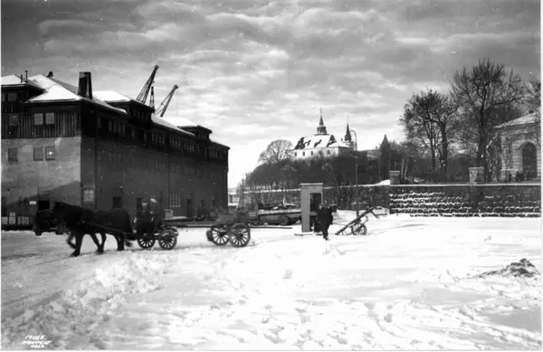 Ved Havnelageret, Oslo 1937. Vinterbilde med hest og kjerre, telefonkiosk og Akershus slott i bakgrunnen.