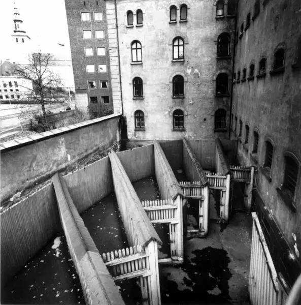 Utsikt over luftegårdene i Oslo kretsfengsel, Møllergata 19, oppført 1866, fot. 1975.