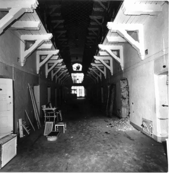 Oslo kretsfengsel, Møllergata 19, fotografert 1975, oppført 1866. Korridor i 2. etasje.