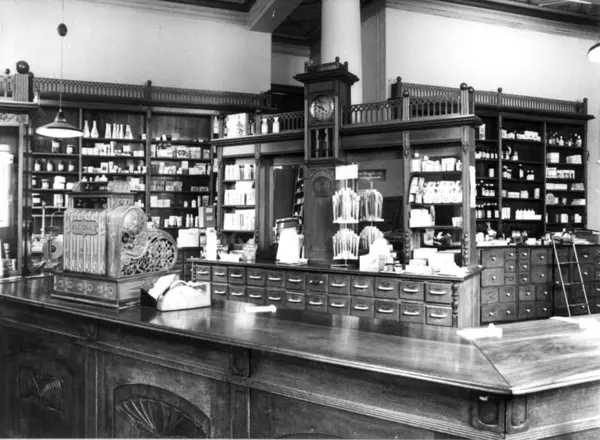 Rodeløkken apotek i Helgesensgt. 44, Oslo. Opprettet 1897. Holdt til samme adresse frem til 1981.Inventaret i offisinet er fra 1910. Glasstaket antakelig også fra 1910.
