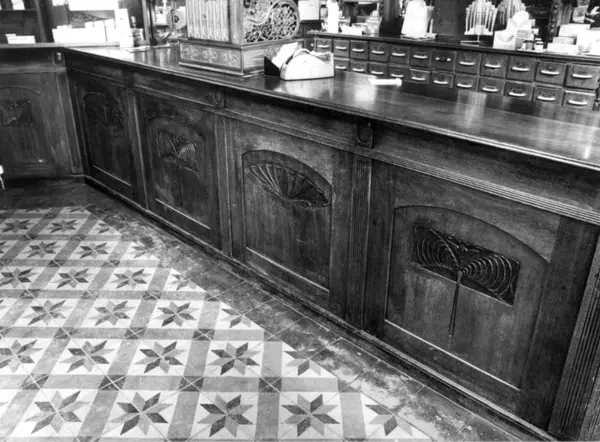 Rodeløkken apotek i Helgesensgt. 44, Oslo. Opprettet 1897. Holdt til samme adresse frem til 1981.Inventaret i offisinet er fra 1910. Glasstaket antakelig også fra 1910.