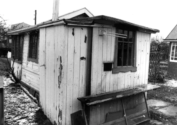 Etterstad Kolonihage, Oslo 1981. Kolonihagehus med hage. Øst med benk og sydvegg.