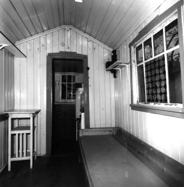 Etterstad Kolonihage, Oslo 1981. Kolonihagehus, soverom med benk og vindu. Døråpning mot kjøkkenet.