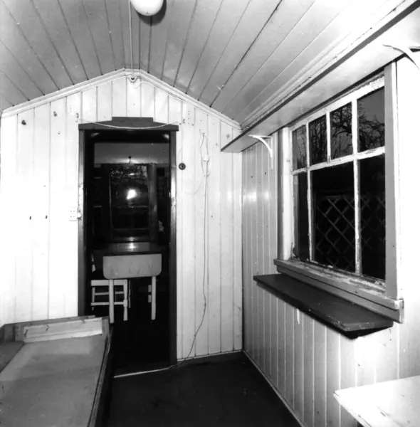 Etterstad Kolonihage, Oslo 1981. Kolonihagehus, soverom med benk og vindu. Døråpning mot stua.